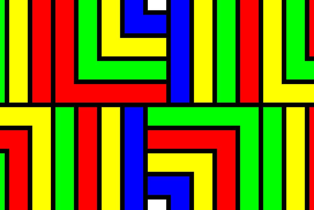 De basispatronen zijn 2 x 5 L-vormige stroken in zwart. De ruimte tussen de stroken is nu gevuld met kleur.