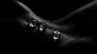 Deze intrigerende zwart-witfoto vangt drie ijsklontjes die langzaam smelten op een naakte huid, waarbij druppels water over het oppervlak glinsteren. Het spel van contrasten maakt dit beeld bijzonder krachtig: de koude hardheid van het ijs tegenover de zachte rondingen van de huid, en het heldere licht van de druppels tegen de donkere achtergrond. Dit kunstwerk balanceert perfect tussen sensualiteit en abstractie. Het roept nieuwsgierigheid op, want het vertelt een verhaal van spanning tussen warmte en kou, hard en zacht, strak en vloeiend.