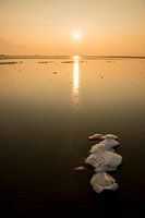 Arctisch ijs en zee panoramisch landschap op de zandplaten in de Waddenzee op het eiland Schiermonnikoog tijdens een koude winterse zonsondergang.