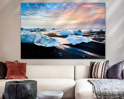 Als enorme, ongeslepen diamanten ligt het afgebroken ijs van de Vatnajökull op het zwarte lavastrand in Zuid-IJsland. Het heldere blauw van het ijs en het gitzwarte lavazand vormen een indrukwekkende eenheid, terwijl de dageraad de hemel baadt in een warm oranje licht. Dit Scandinavische landschap is doordrongen van een bijna mystieke stilte, die alleen wordt onderbroken door het verre geluid van de zee.