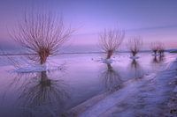 Ondergelopen uiterwaarden tijdens de hoogwater- en vorstperiode in januari. Op plekken waar het water zwak stroomde vormde zich ijs. Het ijs had zich gehecht aan de boomstammen.