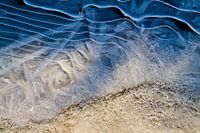 Bevroren rivier. De zandige gele laag is zichtbaar door het ijs. Het ijs heeft het bewegende water bevroren in een mooie structuur.