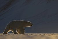 IJsbeer lopend in weids ijslandschap op Spitsbergen.
