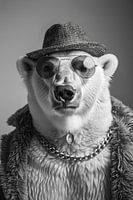 Uniek monochroom portret van een ijsbeer, gestileerd met hoed, ketting en zonnebril. Artistieke afbeelding van een dier in menselijke mode.