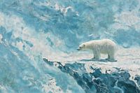 Een eenzame ijsbeer staat op de rand van een ijzige klif, omgeven door een golvende zee van bevroren water en marmerachtige texturen. De compositie ademt stilte en kwetsbaarheid, terwijl het dier dapper het witte landschap verkent. Het werk maakt gebruik van koele blauwtinten en zachte, vloeiende lijnen om de kou en de ongrijpbaarheid van de poolgebieden te vangen. De abstracte benadering van het ijs geeft het geheel een bijna dromerige, onwerkelijke sfeer. Deze visuele vertelling roept vragen op over klimaat, natuur en bestaansrecht, en past moeiteloos in zowel moderne als minimalistische interieurs die rust en reflectie zoeken.