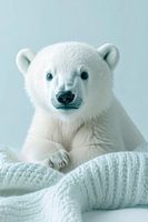 Een schattige ijsbeer welp, wit pluizig met kleine ronde oortjes en donkere oogjes en neus. Hij ligt op een grof gebreide lichtblauwe wollen deken, ook de achtergrond is lichtblauw. Het straalt een frisse winterse sfeer uit, precies waar de ijsberen zo van houden. Het beeld is met behulp van ai gegenereerd.