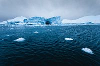 Kleine, afgebroken stukken ijs drijven weg van een grote ijsberg met gat in het Ilulissat Icefjord in de Disko Bay (Diskobaai) van Groenland. Hier kalft gletsjerijs in hoog tempo af, om vervolgens door de beperkte diepte een tijd te worden vastgehouden. Het levert een prachtig spektakel met ijsbergen in alle vormen en maten op.