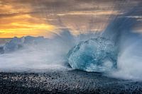 Woeste golven slaan op een ijsberg op het lavastrand op het zwarte lavastrand nabij het Jokulsarlon ijsmeer in IJsland. De ijsbergen breken af van de gletsjer en drijven vervolgens richting zee. Na verloop van tijd spoelen sommige ijsbergen weer aan op het strand, waar ze langzaam wegsmelten.