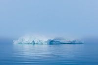 Een grote ijsberg doemt langzaam op uit de zeemist boven de windstille wateren van de Disko Bay (Diskobaai) in Groenland.