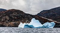 Een blauwe ijsberg drijft eenzaam op het tij langs de rauwe kustlijn van West Groenland, nabij het dorp Aasiaat. De combinatie met het donkere, stemmige weer geeft een goede indruk van deze regio. Op het land zijn de herfstkleuren goed zichtbaar.