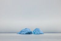 Twee blauwe ijsbergen in een verder grijze zee in de Disko Bay van Groenland.