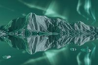 IJsbergformatie omgeven door ijskappen, verlicht door noorderlicht
