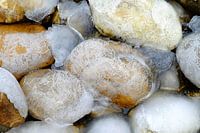 Het ijs lijkt op " kant" wat zich over de stenen heeft uitgespreid. De warme oker kleur mengt zich mooi met het ijzige wit.