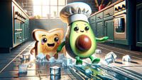 Deze scène, waarin avocado en toast dansen op een stortvloed van gesmolten ijs, biedt een pittige verfrissing. Hun ogen glinsteren van genot als ze speels tussen de ijsblokjes glijden die over de keukenvloer verspreid liggen. De zon schijnt door het raam en versterkt het gevoel van zomer en vreugde. Water spat in het rond alsof het…
