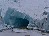 Close-up van de ingang van een ijsgrot aan de rand van de Svínafellsjökull gletsjer in het Vatnajökull Nationaal Park in Zuid-IJsland in de winter met gletsjermeer en glinsterend blauw ijs.