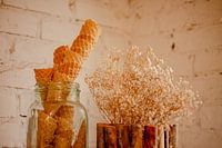 Knapperige hoorntjes in een glazen pot naast droogbloemen tegen een witte bakstenen muur. Zachte, warme tinten.