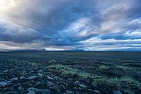 IJsland - Brandende hemel over eindeloze zwarte lavavelden en bergen bij zonsondergang met kleurrijke gloeiende wolken