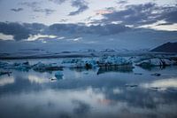 IJsland - Gloeiende ijsschotsen in gletsjerlagune bij middernacht, magisch weerspiegelend in het stille water