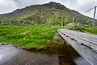 IJsland - Groene berg en enorme stenen met rivier en houten brug over mooi riviertje in ongerept ijslands natuurlandschap, panorama uitzicht