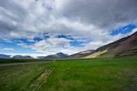 IJsland - Groene vlakte met straat tussen vulkanen en gletsjers, indrukwekkend natuurlandschapspanorama