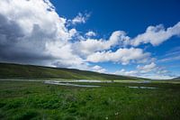 IJsland - Natuurlijke beekloop door ongerept weids groen landschap met aankomend onweer
