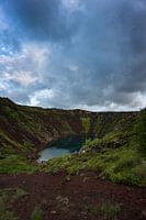 IJsland - Rode grond en groene planten bij het Kerid kratermeer, een prachtige, magische, majestueuze plek in een ongerept natuurlandschap