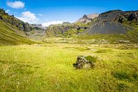 IJsland landschap in de Múlagljúfur canyon met gras en mos bedekte rotsen en de Hangandifoss waterval die van de gletsjer naar beneden komt op de achtergrond bij Hof aan de zuidkust van IJsland. Múlagljúfur Canyon is een prachtig natuurwonder gelegen in het zuiden van IJsland, in de buurt van de stad Kirkjubæjarklaustur. De canyon beschikt over torenhoge rotsformaties, diepe ravijnen, en prachtige watervallen. De wanden van de kloof zijn gemaakt van vulkanisch gesteente en zijn vaak bedekt met levendig groen mos, dat een opvallend contrast vormt met de donkere rotsen. Er stroomt ook een rivier door de canyon, wat het landschap nog mooier maakt. Bezoekers van de canyon kunnen wandelen langs de paden die door het gebied lopen, met mogelijkheden om een aantal indrukwekkende watervallen te zien, waaronder de Foss á Múlafossi waterval, die meer dan 30 meter naar beneden valt in een poel eronder. De canyon staat ook bekend om zijn wildlife, met een verscheidenheid aan vogels en andere dieren die in het hele gebied kunnen worden gespot. Al met al is de Múlagljúfur Canyon een must-see bestemming voor iedereen die IJsland bezoekt, met zijn unieke geologische kenmerken en adembenemende natuurlijke schoonheid.