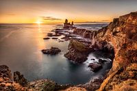 Zachte zonsondergang op IJsland bij de rotsen Longdrangar aan de westelijke zuidkust van het schiereiland Snæfellsnes.
