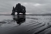 Opvallende rotsformatie in ondiep water op een zwart strand met een patroon van zandstrepen en een restje rood avondlicht - Ligging: IJsland, oostkust van het schiereiland Vatnsnes in het noordwesten, Hvítserkur