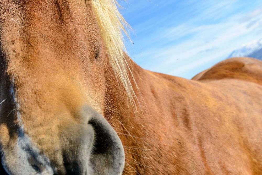 Close up van een IJslands paard met de Hekla vulkaan in de achtergrond.