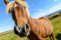 Close up van een IJslands paard met de Hekla vulkaan in de achtergrond.