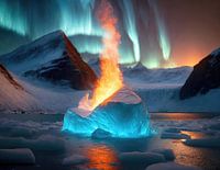Boven deze bevroren wonderen danst de aurora borealis, een schilderachtige wervelwind van licht en kleur, die de nachtelijke hemel betovert met haar magische dans. En op de horizon rijzen de besneeuwde bergtoppen op als wachters van de tijd, hun witte kruinen reikend naar de hemel, fluisterend verhalen van oude tijden en eeuwige schoonheid.