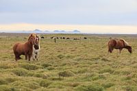 IJslandse paarden in een weide met de Westman-eilanden op de achtergrond