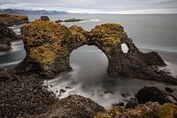 Deze hele speciale rots heet Gatklettur en ligt op het schiereiland Snæfellsnes in het westen van IJsland. Hier zijn ook weer veel basalt formaties zoals op meerdere plekken in IJsland. De foto is gemaakt met een lange sluitertijd om het water in de zee wollig te laten uitzien. Het is een mooie plek om lang te kijken naar de golfslag die door het gat in de rots tegen de kust aanslaat.