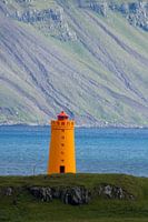 Gele vuurtoren in IJslands landschap