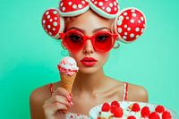 Een vrolijke rel van kleur ontvouwt zich met een levendige figuur die in het oog springt met rode, gestippelde haaraccessoires en een opzichtige zonnebril. Een ijshoorntje en een bord vol lekkernijen in haar handen geven het tafereel een speels tintje. Perfect voor de keuken of een gezellig café, het brengt een zomerse stemming en verwennerij in elke kamer.