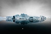 Dramatische ijsschotsen weerspiegelt in een diep zwarte oceaan, met daarboven een grijze onheilspellende lucht. Deze ijsbergen en ijsformaties zijn kenmerkend voor Disko Bay, Groenland.