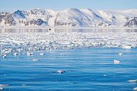 IJsschotsen zover je kunt kijken. De zee is vaak bevroren in de winter. Wanneer het warmer word komen ze los van elkaar en beginnen ze te drijven. Van de ijsschots zie je maar een paar procent. Het grootste gedeelte zit onder water.