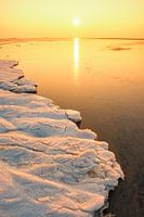 IJsschotsen op het wad van Schiermonnikoog in de Waddenzee tijdens een koude winterzonsopgang.