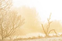Zonsondergang over een besneeuwd winterlandschap in de uiterwaarden van de rivier de IJssel in Nederland.
