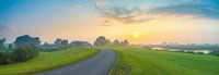 Zonsopgang over de oeverwal langs de IJssel bij Kampen in Overijssel tijdens een mistige herfstochtend. Breed panorama foto.