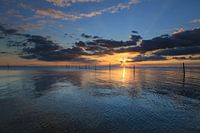 Zonsondergang boven een windstil IJsselmeer met fuikenstokken. Boven de wolken schijnt een zonneharp door de ondergaande zon. Aan de horizon zijn links de Markerwadden nog te zien, en rechts de kust van Noord-Holland net onder Enkhuizen.
