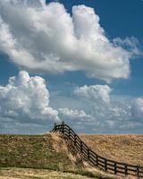 IJsselmeerdijk vlak bij Mirns met een hek en een stevige wolkenlucht er boven