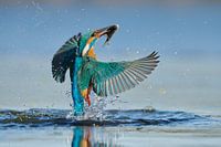 In een flits duikt de ijsvogel in het water, een fractie van een seconde later komt hij er weer uit, in zijn snavel een gevangen visje. In een nog kortere flits leg ik hem vast op de gevoelige digitale plaat.