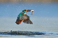 In een flits duikt de ijsvogel in het water, een fractie van een seconde later komt hij er weer uit, in zijn snavel een gevangen visje. In een nog kortere flits leg ik hem vast op de gevoelige digitale plaat in een wolk van druppels.