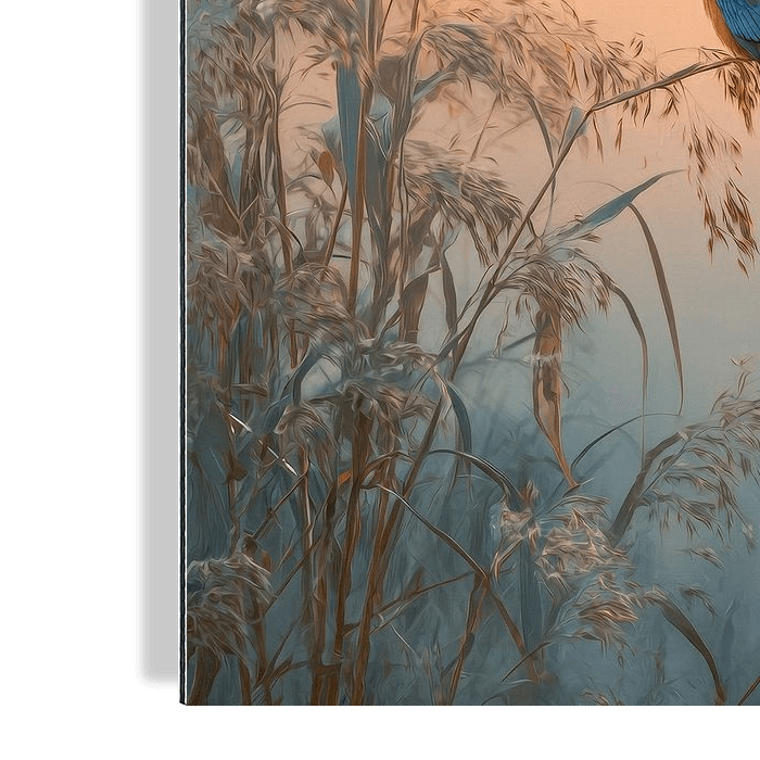 Een prachtige ijsvogel rust op een tak boven het kalme water, terwijl het warme licht van de zonsopkomst de scène omhult in een dromerige gloed. De zachte kleuren en het detail in het verenkleed maken dit kunstwerk tot een rustgevende blikvanger voor ieder interieur.