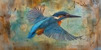 Een ijsvogel zweeft sierlijk door de lucht, gevangen in een moment van perfecte balans en stilte. Zijn blauwe en oranje verendek contrasteert prachtig met de zachte, abstracte achtergrond van warme aardetinten en blauwgroene zweem. Dit werk vangt niet alleen de vogel, maar ook de beweging—een bevroren seconde waarin energie en elegantie samenvallen.