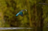 De ijsvogel het mooiste vogeltje van Nederland op weg weer naar de tak met gevangen vis. Deze slaat hij dood op de tak en slikt hem dan met de kop van de vis al eerste naar binnen. Dit doet hij zo'n 15 tot 20 keer op een dag.