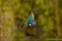 De ijsvogel het mooiste vogeltje van Nederland in volle vlucht op weg naar het visje dat onderwater gevangen wordt door de ijsvogel. Hij vangt de vis met de snavel wat opzicht erg bijzonder is omdat hij de breking van het water weet en zo nooit mist. De fel blauwe en oranje kleur is kenmerkend voor dit mooie vogeltje.