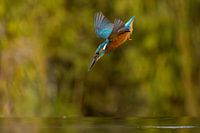 De ijsvogel het mooiste vogeltje van Nederland in volle vlucht op weg naar het visje dat onderwater gevangen wordt door de ijsvogel. Hij vangt de vis met de snavel wat opzicht erg bijzonder is omdat hij de breking van het water weet en zo nooit mist. De fel blauwe en oranje kleur is kenmerkend voor dit mooie vogeltje.